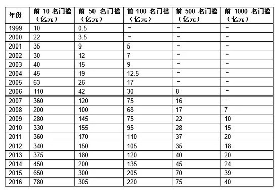 上榜门槛连续四年保持20亿元,今年有2056位企业家上榜,比去年又增加179人,比三年前翻了一倍,上榜人数达历年之最。前10名的上榜门槛比去年提高20%,达到780亿。前1000名的上榜门槛从去年的39亿提高到40亿。